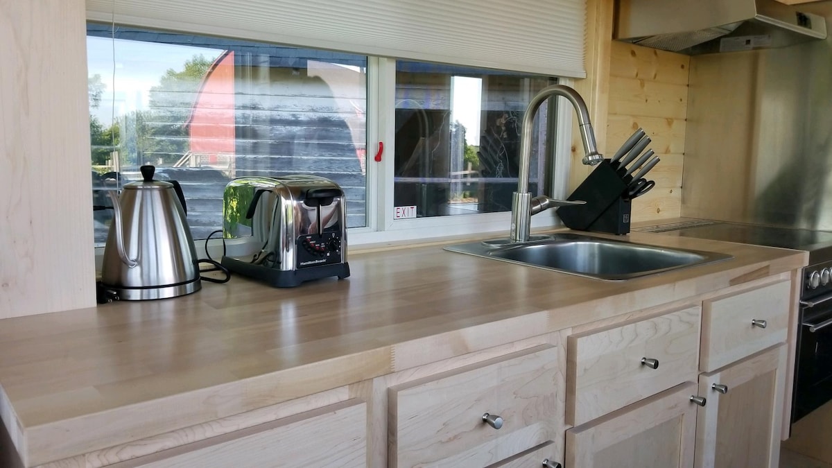 Trout Lily Farm is a beautiful, peaceful six acre hobby farm. The Tiny has its own semi-private area by apple trees and a scenic barn, with its own patio table/chairs, barbecue, and firepit. This 168 square foot one-level Tiny is suitable for 1-2 guests (one queen bed). Running purified water, electrical/propane stainless appliances, full tub/shower, composting toilet, internet. Fully furnished, with dishes, coffee maker and electric kettle, linens and toiletries.