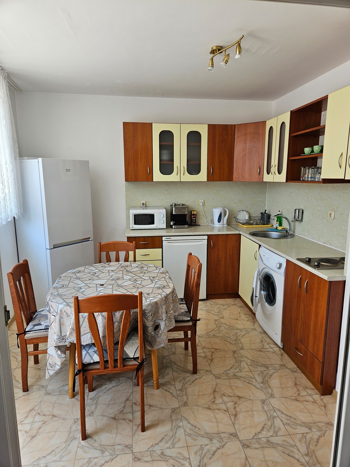 Предлагаем трехкомнатную квартиру в Несебре в 50 метрах от пляжа с двумя спальнями, гостиной с кухней и двумя террасами. В одной комнате есть спальня и диван, который раскладывается. Вторая спальня отдельная, а в гостиной могут спать двое детей. Есть отдельный рабочий уголок. В квартире есть стиральная машина, сушилка, большой холодильник, плита, посудомоечная машина, кофемашина, чайник, телевизор, интернет. С видом на море. 15 минут пешком до Старого города, и до Солнечного берега можно добраться на поезде. Есть кондиционеры во всех комнатах.