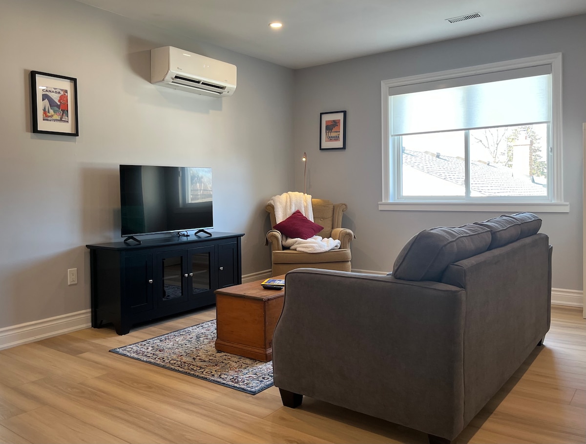 Private 3-room apartment in house• 700 sq ft • Steps to the Shaw Theatre. Plush king bed and big-screen TV sitting area. A futon or trundle bed can be added for a 3rd & 4th guest. Kids and dogs welcome. Two cozy adjoining rooms serve as a kitchenette & extra room. Massive en suite with tub & shower, plus all your toiletries . Mini fridge, microwave, coffee & tea station. Fast wifi. Private parking. NOTL STR License No. 105-2021