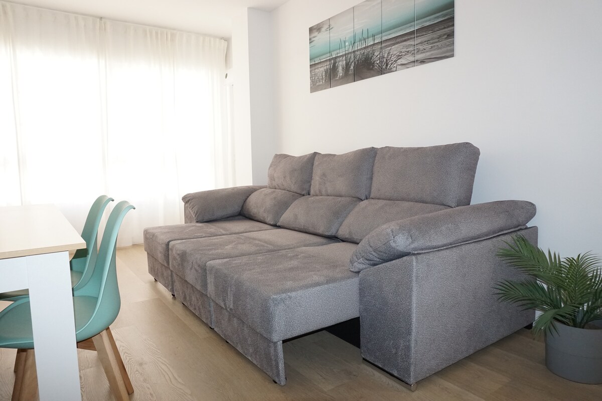 APT1B Apartamento con vistas al mar, a pie cerca de la playa y del puerto deportivo, perfecto para visitar toda la Ría de Arousa y otros pueblos cercanos de especial interés turístico, nos encontramos a menos de 1h de Santiago de Compostela . La parada de bus está a 5min. andando y la frecuencia es cada hora. Hay supermercados, tiendas y bares cerca. Hay bus urbano también. Se entrega totalmente acondicionado con ropa de cama, toallas y menaje de cocina. Situado en una zona segura y sin ruido.