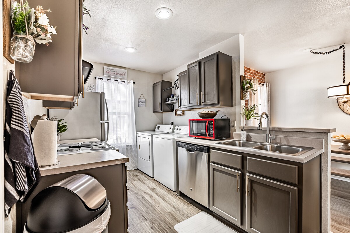 Дом с 4 кроватями и 2 ванными комнатами рядом с готовым для семейного или группового отдыха. Этот одноэтажный дом с открытой планировкой, жилой площадью 2100 кв. футов, стиральной/сушильной машиной, полностью меблированной кухней, уютной гостиной с камином и домашним офисом. Смарт-телевизоры во всех комнатах и портах Ethernet в офисе. Снаружи в этом доме установлены камеры, которые можно увидеть с кухни. Дом расположен недалеко от H-E-B, в 15 минутах от Fort Hood Main, в 40 минутах от Georgetown, в 60 минутах от Остина. В этом жилье нет доступа к гаражу.