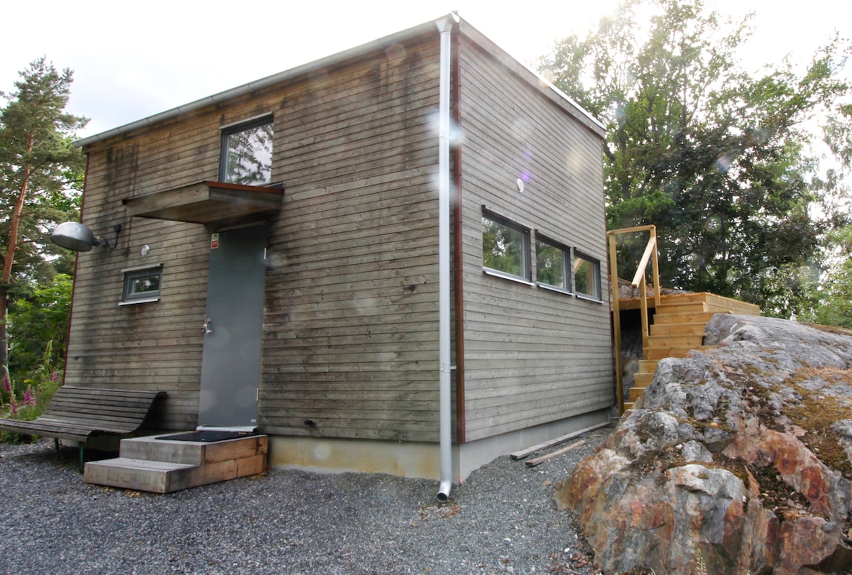 Sjönära mysig stuga på 40 kvm med fönster ut mot havet och bryggan. Veranda med utemöbler. Golvvärme i hela huset och även braskamin i vardagsrummet. En korg ved ingår. Öppet kök med ugn, spis, micro, kaffebryggare, tekokare, kyl/frys och diskmaskin. Vardagsrum med bäddsoffa (140cm) och bord/stolar. Sovrum med 2 sängar. Toalett och dusch. Kanot finns att låna sommartid. Övrig tid i samråd. Husdjur och rökning ej tillåtet. Sängkläder, handdukar, kökshanddukar ingår. 45 min bilväg från Stockholm.