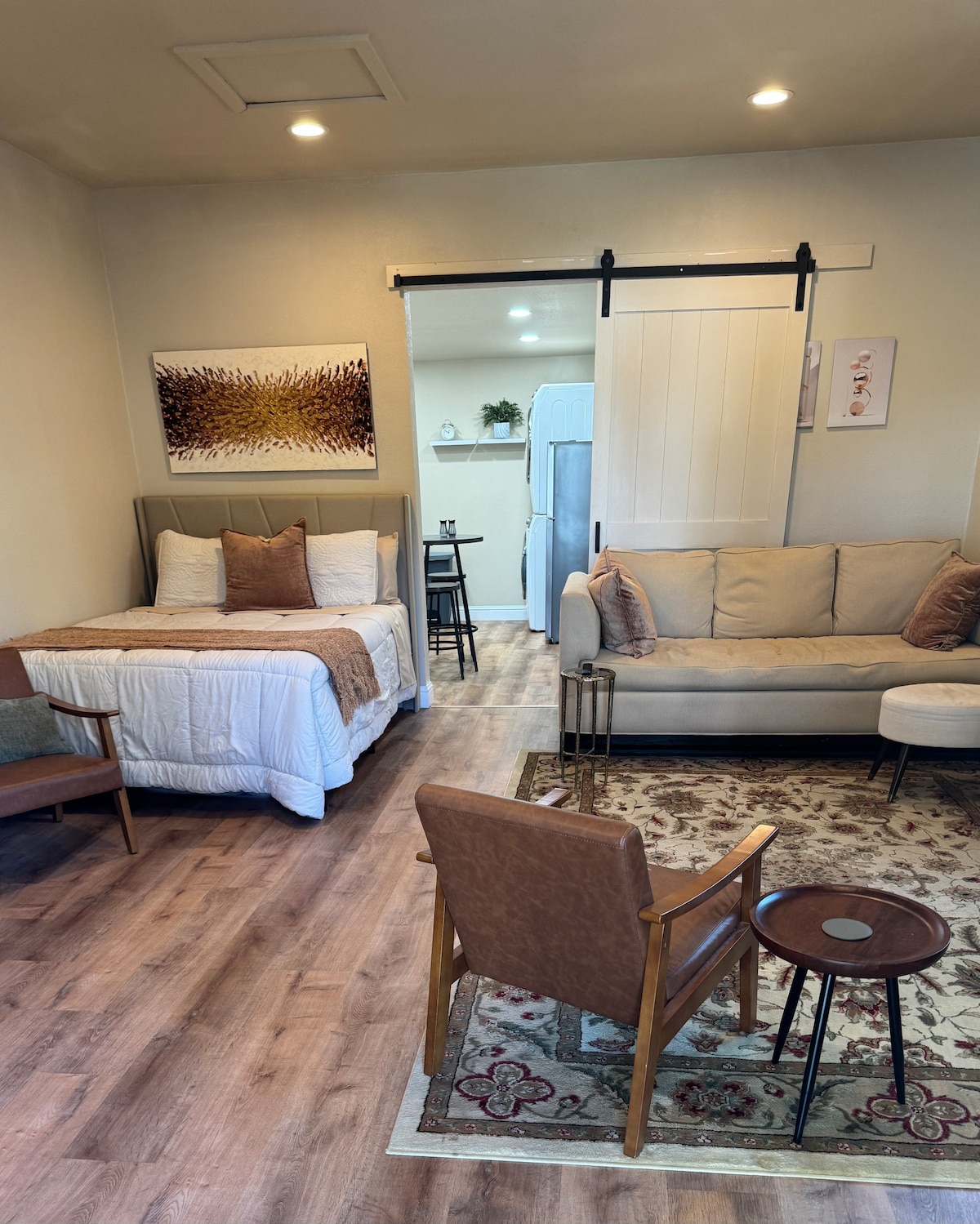 ДЗЕН встречается с СОВРЕМЕННОСТЬЮ: уединенный, просторный дом с 2 спальнями/1 ванной комнатой, идеальное место для отдыха, + большая зона отдыха в патио на открытом воздухе с грилем и местом для костра. Полностью оборудованная кухня с кофемашиной Keurig, холодильником, микроволновой печью, плитой, духовкой и посудомоечной машиной LG Suite. Кровати размера Queen size в каждой спальне и на диване-кровати. Бесплатная зарядка Tesla (EV). Расположен в квартале Old Folsom от Sutter St. В пешей доступности от кафе, ресторанов, баров, магазинов, продуктовых магазинов, велосипедных дорожек и многого другого!