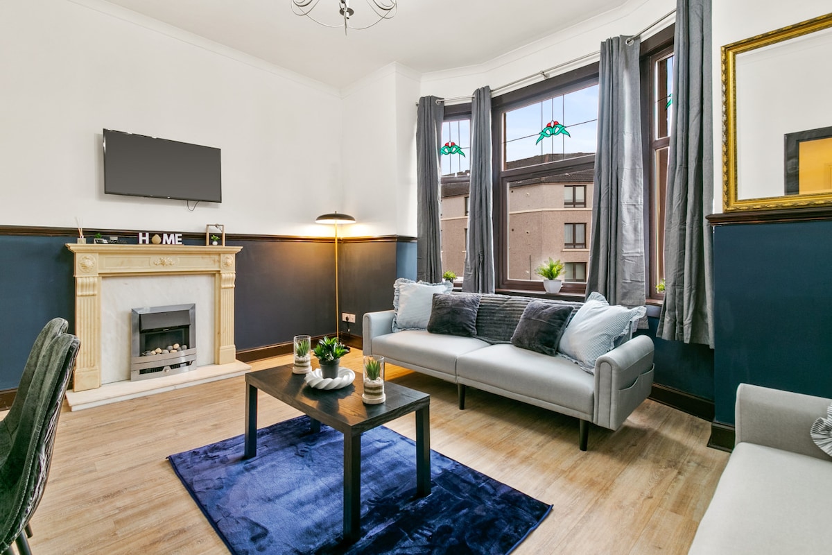 2 bedroom Beautiful Apartment - only a short drive from Glasgow City Centre. Each bedroom has a workspace desk, comfy bed with linen & towels, and mirror wardrobe for you to get ready to explore the area. Living area with dining table, WI-FI, and TV to enjoy favourite programmes or You tube. Kitchen is equipped with cooking essentials such as pots/pans, coffee machine, toaster, microwave & gas cooker. 🗝 2 Bedroom Apartment - up to 4 guests 🗝 2x Double Beds 🗝 Professionally Cleaned