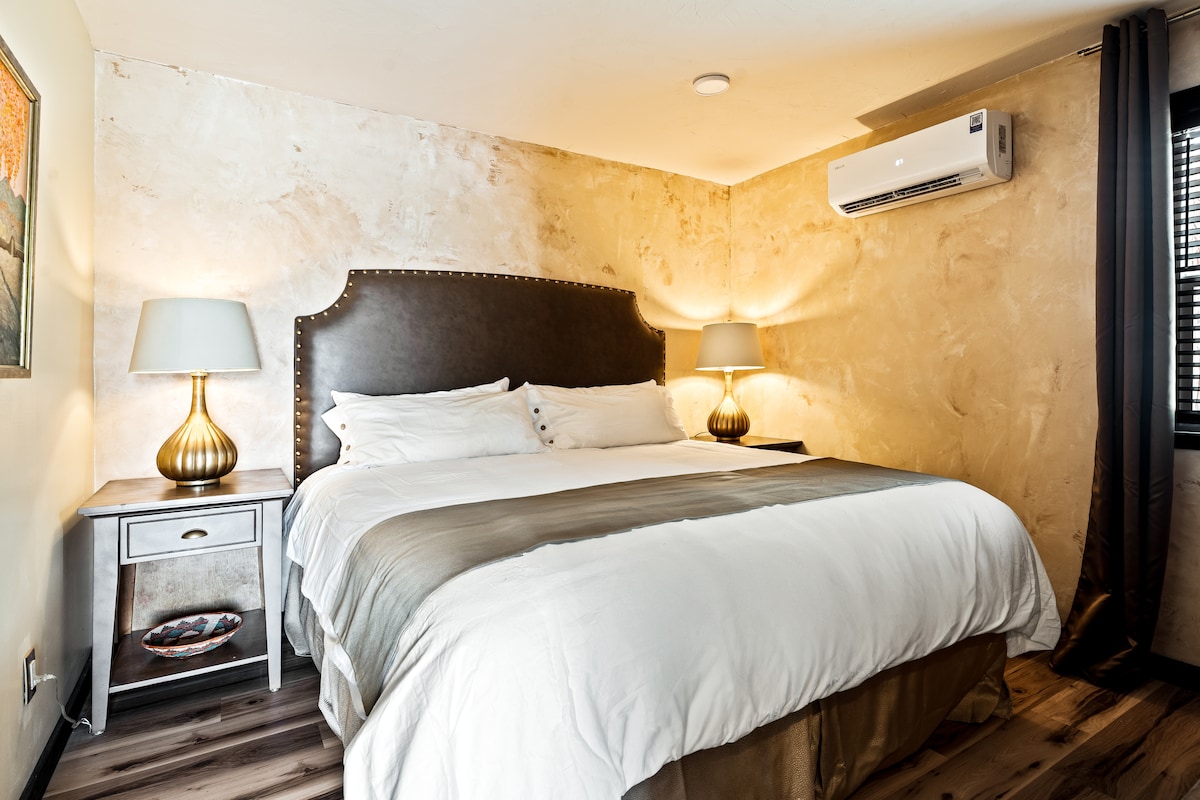 ✨ Романтическая студия «Sunflower»: умиротворяющий спа-оазис 🌲 1 миля до Plaza, 1,6 мили до Canyon Rd; парковка вне улицы, отдельный вход, ванная комната и полностью укомплектованная кухня • Полностью частная гидромассажная ванна (с низким содержанием химических веществ) • Сауна + спа-цикл с холодным погружением 🔥❄️ • Местные шоколадные трюфели 🎁 • Проектор для ночей кино 🍿 • Органический кофе, чай и отборные закуски ☕️ • Уютные халаты. • Освещение для настроения • Быстрый Wi-Fi. • Кондиционер + отопление. • Экологичная уборка • 🐶 дружелюбный ✨ Идеально для пар, которые ищут спокойное место для отдыха в нескольких минутах от площади 🌻