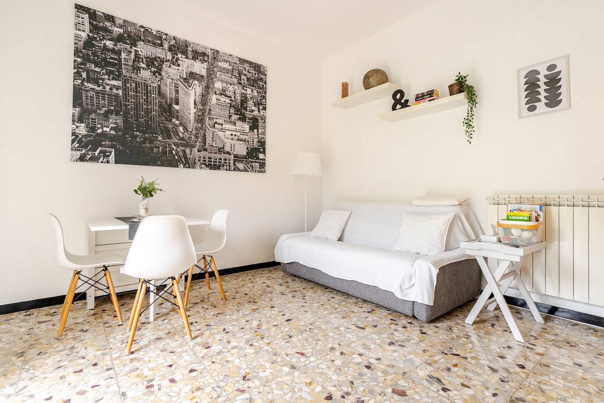 APPARTAMENTO ALLA CASTAGNA A2: Bilocale in perfetto ordine composto da camera da letto matrimoniale, sala, cucina, bagno e giardino ampio e godibile (possibilità di tavolino e sdraio). Unico nel suo genere in luogo tranquillissimo, a pochi passi dal centro e dal mare, in mezzo al verde adiacente al grande parco di Villa Durazzo. Dotato di un ottima WIFI che permette di lavorare da remoto.
