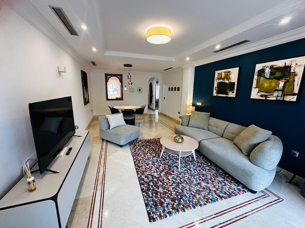 Откройте для себя современный комфорт в нашей новой квартире с двумя спальнями, всего в 10 минутах ходьбы от пляжей Эстепоны и оживленного центра города. Идеально подходит для четырех гостей, к услугам гостей двуспальная кровать размера Queen size, две односпальные кровати, полностью оборудованная кухня, смарт-телевизор, шикарная гостиная, быстрый Wi-Fi, кондиционер, безопасный вход, общий бассейн и игровая зона на открытом воздухе. До супермаркетов, ресторанов и кофеен всего 1-2 минуты.