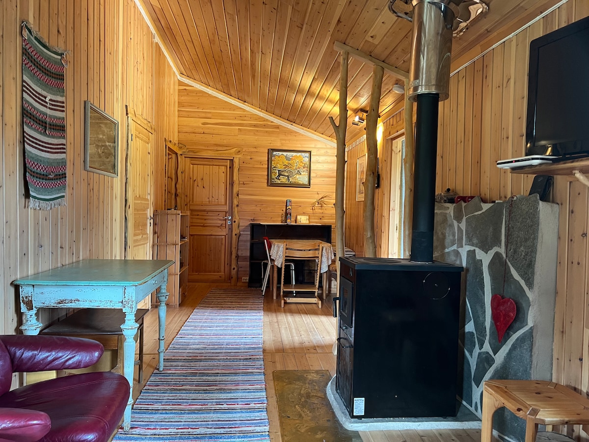 Pieni mökki suurilla lasi-ikkunoilla ja revontulinäkymillä. Puulämmitteinen sauna ja hierova poreallas terassilla, jonka vapaa käyttö sisältyy hintaan. Lemmikit sallittuja, mutta niistä peritään lemmikkimaksu. Small cottage with northern lights view. Sauna with wood-burner stove. Luxury jacuzzi is available for free.