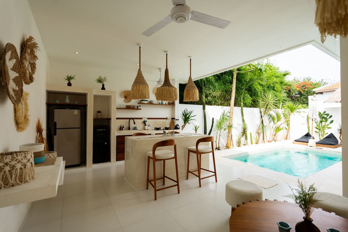 Новая вилла в Унгасане, Южная Кута • Стильная спальня с кондиционером и видом на сад • 1,5 ванных комнаты, одна с ванной + косметика и фен • Полностью оборудованная кухня и столовая • Большой бассейн, просторный патио и тропический сад для вечернего отдыха • Рабочий стол, сейф и гладильные принадлежности • Wi-Fi 300 Mbps • Ежедневная уборка, свежие полотенца и постельное • Детская кроватка и стульчик по запросу • Netflix и PS5 по запросу • Консьерж-сервис: аренда скутеров, трансфер и др