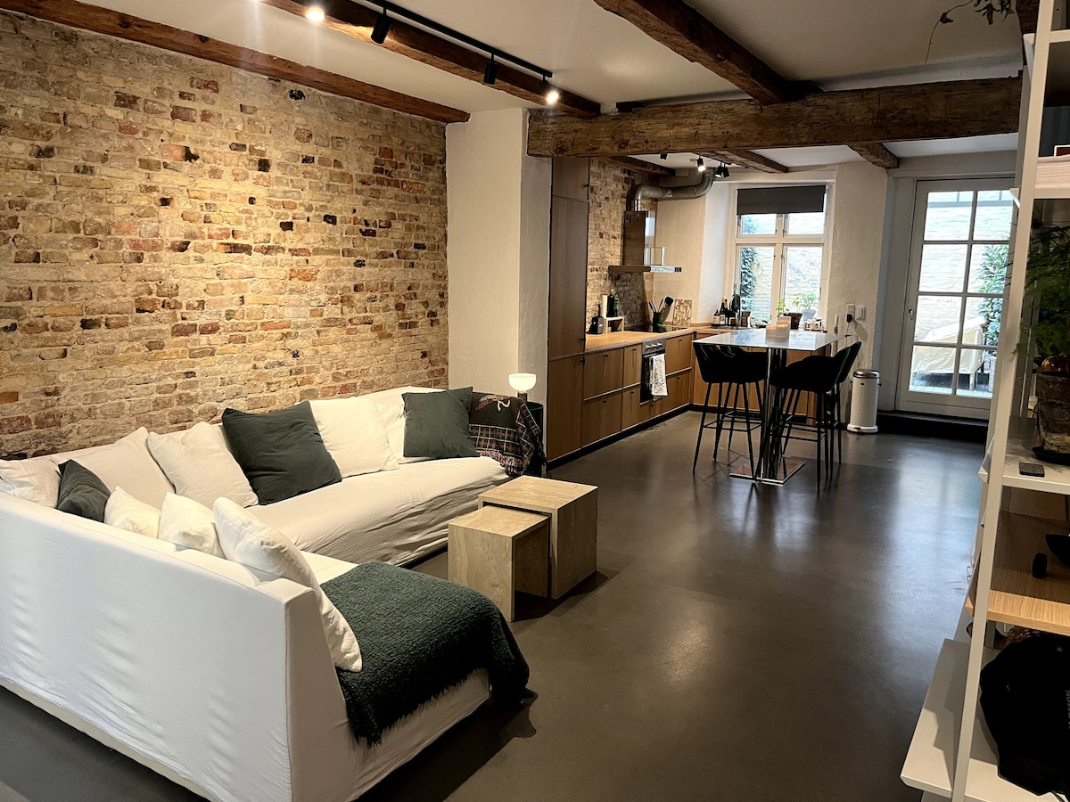 Воплощение ХЮГГЕ! Роскошная расслабленная атмосфера скандинавского периода в центре города. Камни в шаговой доступности от Tivoli & City Hall. В этой квартире, стильно отреставрированной, есть удобная кровать размера «king-size», ванная комната с тропическим душем/современная кухня/уютная гостиная и гардеробная. Наши гости говорят нам, что они любят эту редкую квартиру в саду, но тихий частный двор - это то, что делает ее такой уникальной. Мы живем наверху в нашей скрытой жемчужине с 1730 года, расположенной Strøget в Марэ CPH:"Pisserenden" IG:@historichouseandgarden
