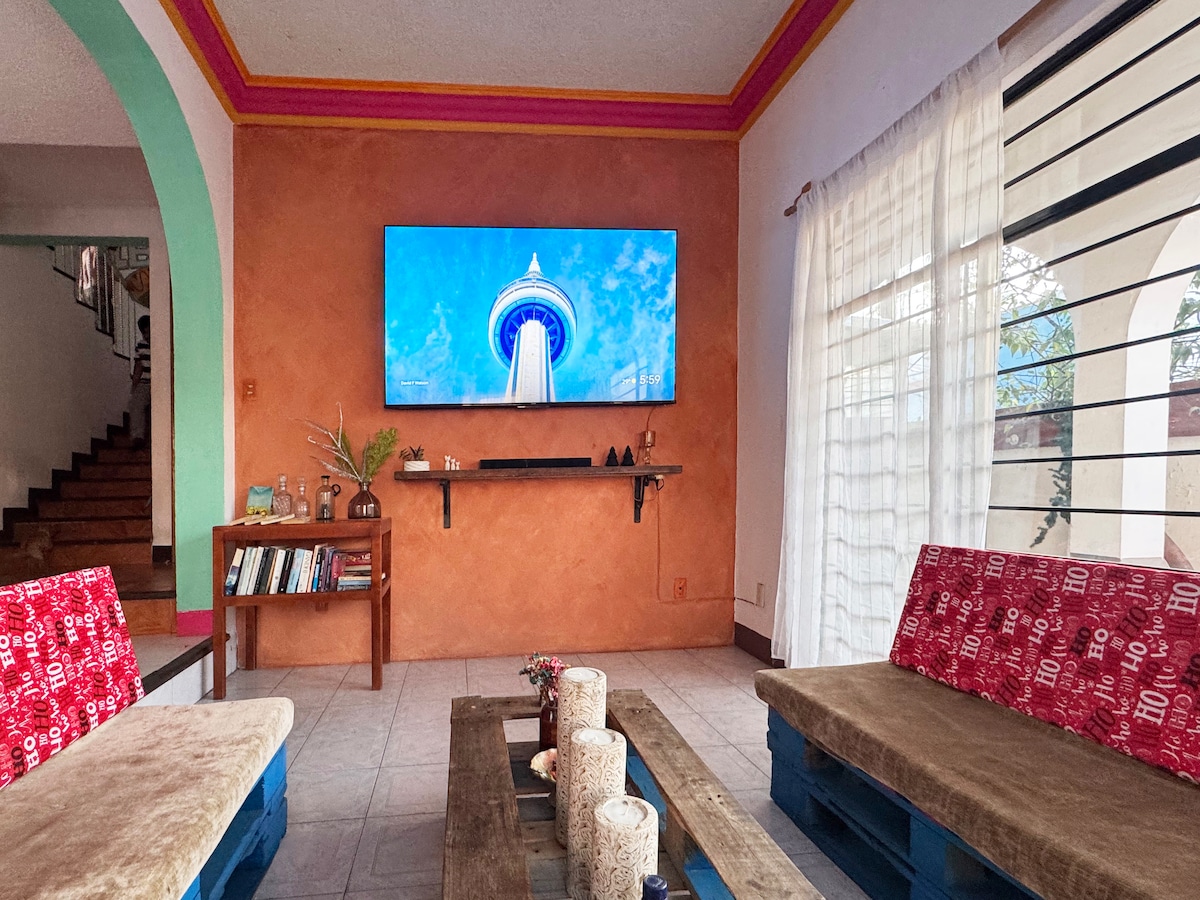 Big House in Jalatlaco features 4 bedrooms, 3 bathrooms with ceiling fans, one bedroom on the main floor in suite, 3 bedrooms in the second floor, 1 in suite and 2 bedrooms sharing bathroom. The full house has a water softener. Amazing covered rooftop terraza with views all over the valley and the Auditorio Guelaguetza. 100 mbps wifi through out the property. Our new LED fireplace on the terrazza overlooking the city. Our villa is big, has many spaces for friends and family.