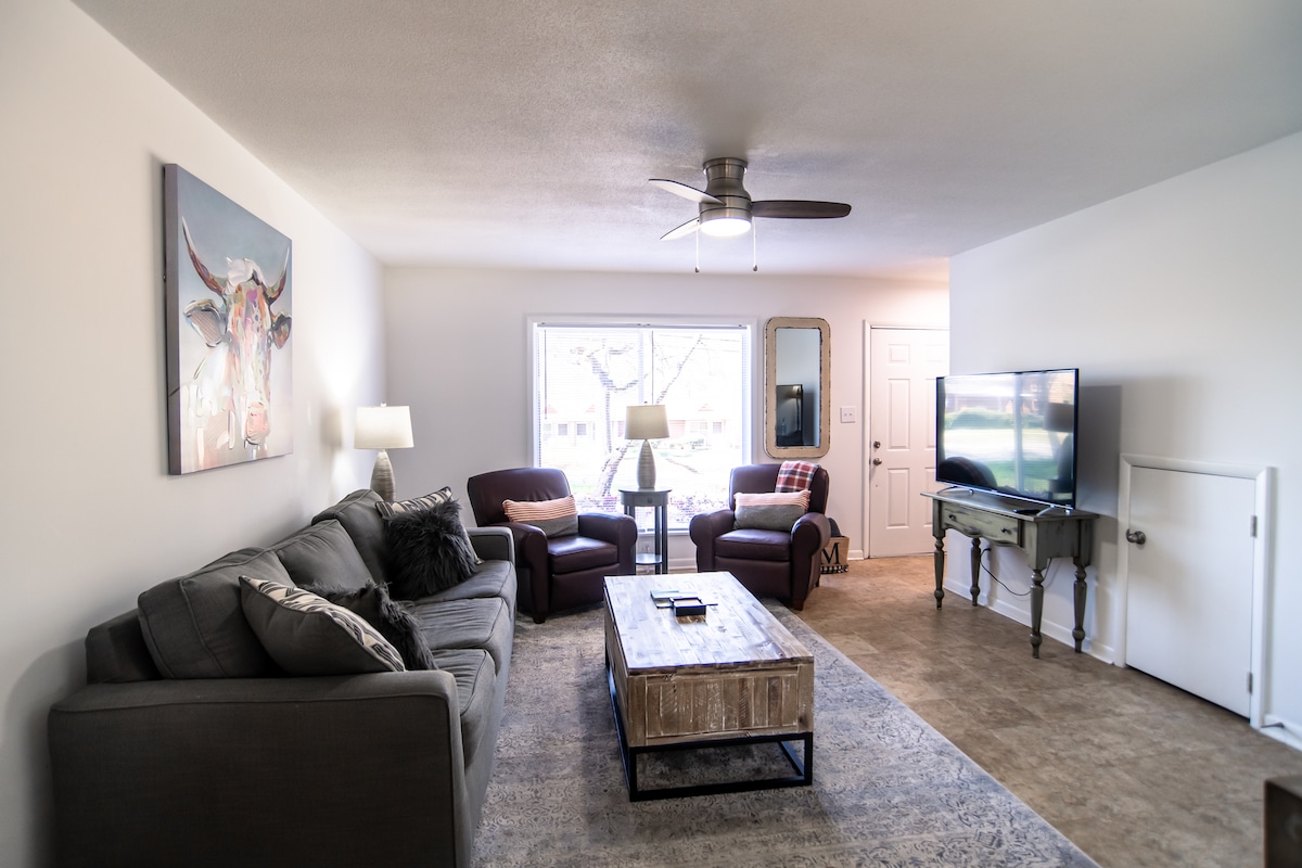 Просторная квартира с 2 спальнями / 2 ванными комнатами в нескольких минутах ходьбы от исторического центра Афин, кампуса Университета Джорджии и стадиона Санфорд, ресторанов и многого другого! Бесплатный Wi-Fi, бытовая техника из нержавеющей стали, HD-телевизор, полностью укомплектованная кухня (кастрюли и сковородки, посуда для готовки и т.д.), электрический камин, открытый патио с креслами. На первом этаже есть удобный доступ для детей и пожилых гостей. В номере 6 комфортабельных номеров ( 1 двуспальная кровать размера «king-size», 1 двуспальная кровать размера «queen-size» и односпальная кушетка с двумя односпальными кроватями). Бассейн открыт сезонно.