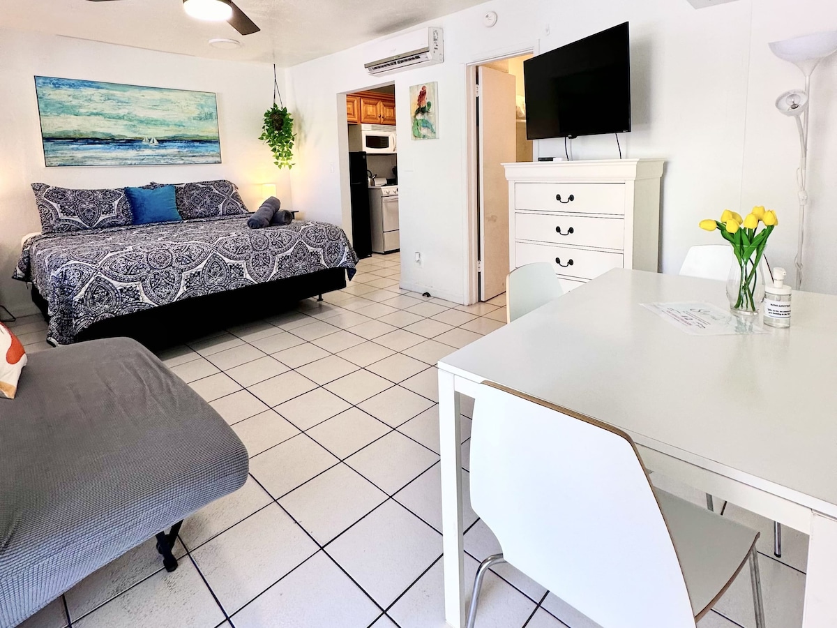 Студия с кроватью размера King size, рядом пляж и рестораны, можно с питомцами