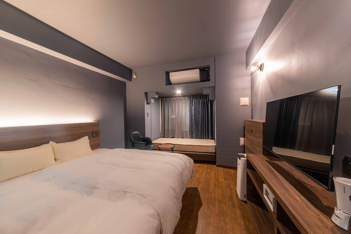 商店街の中の隠れ宿【浮-UKI-】|大画面で映画&バスタイムを楽しむ客室