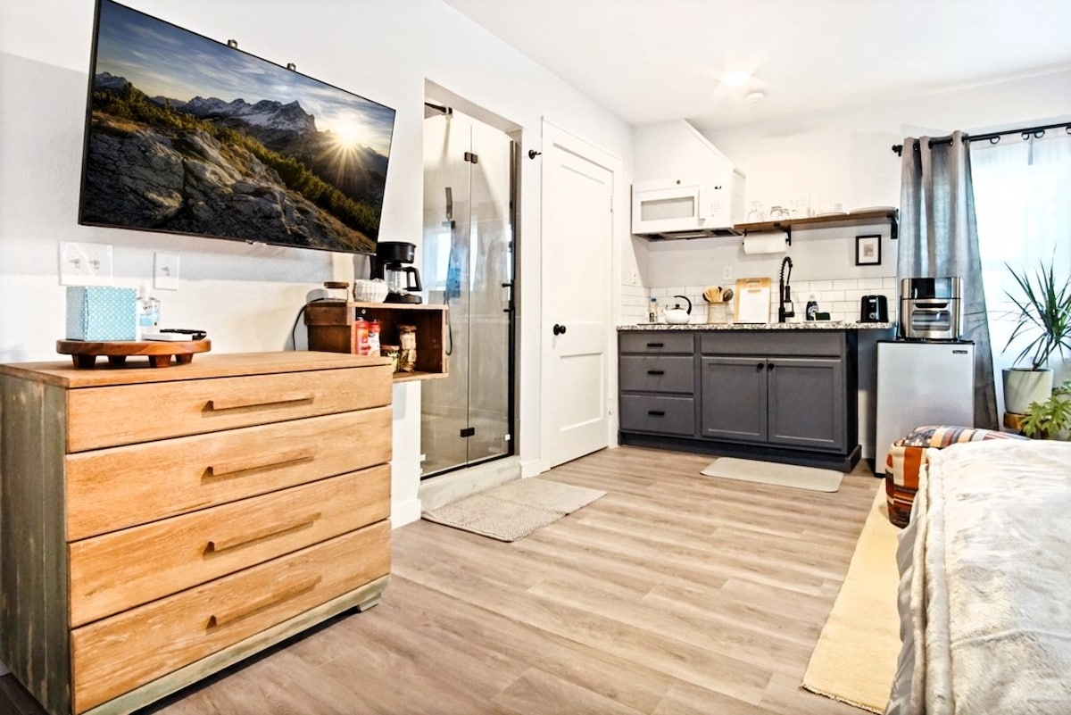 Отличная ночная остановка или неделя вдали от дома. Студия прикреплена к дому домовладельцев (переоборудованное гаражное пространство), но имеет отдельный отдельный кодовый вход. Парковка на подъездной дороге для одного авто. Телевизор с антенной и потоковым видео, бесплатный Netflix, быстрый Wi-Fi. Мини-кухня с кофеваркой, холодильником, раковиной и микроволновой печью. Пустое гнездо занимает дом. Тихий и безопасный район. Максимум два человека. Просторная открытая планировка - одна спальня, одна ванная комната. Кровать размера Queen size.