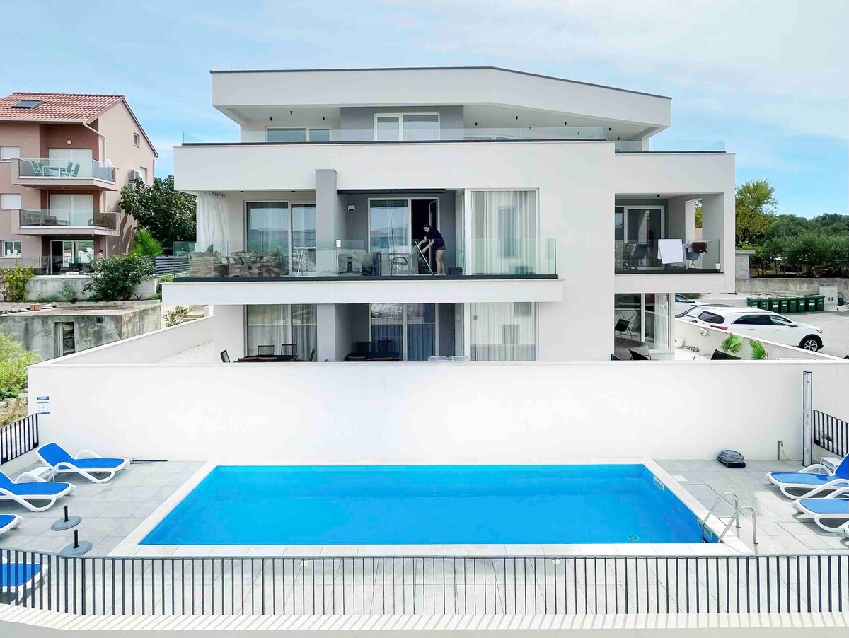 Вилла ZEN Trogir, апартаменты в Трогире — бассейн с подогревом (20 апреля 2026 года — 31 октября 2026 года), кондиционер, Google TV, стиральная машина, моющие средства, большая частная терраса 30 м2, 1 парковочное место, зарядное устройство для электромобилей, доступен тип 2, частный бассейн для 2 апартаментов (максимум 7 гостей) на вилле ZEN. Полноразмерная кухня: стиральная машина, плита, духовка, холодильник, пол с подогревом. Диван в гостиной, 220*300 см. Комната A 160*200 (кондиционер), комната B с 2 кроватями 90*200 (кондиционер) можно объединить. Тихий район, всего в 150 м от пляжа. Добро пожаловать:)