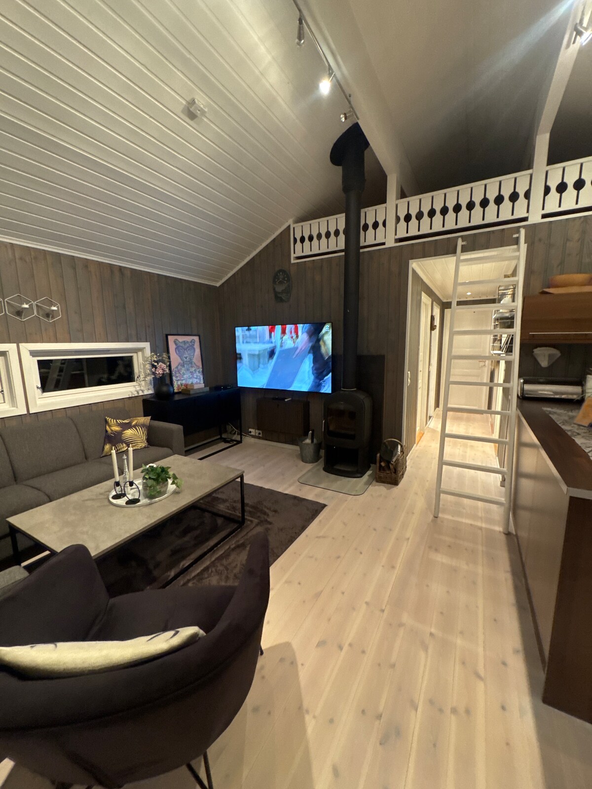 Спокойное жилье для расслабленного семейного отдыха. Парковка на территории жилья. Хижина площадью 110 кв. м хорошо подходит для 5–6 взрослых и имеет собственную игровую комнату для детей. Свет проникает через мансардное окно. Есть электрический подогрев пола и печь, но гости должны покупать дрова. Хижина расположена в популярном районе, где есть много возможностей. Лыжный рельеф, охота и рыбалка. Спуск для слалома 0,5 км Лыжная трасса и трасса для скутеров. Парк для скалолазания. Кафе и ресторан. Около 0,5 км до продуктового магазина Coop. Можно купить дрова для печи, огня. Город в 15 км.