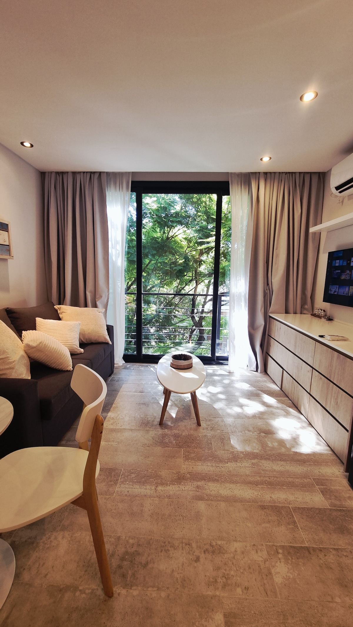 Современная квартира Domus Puerto de Olivos с видом на реку (восточная сторона), много естественного и зеленого света. К услугам гостей 54 м2 на открытом этаже, интегрированная кухня, обеденный стол, двуспальная кровать и террасный балкон - гостиная. Кондиционер, подогрев пола, телевизор, WI-FI и полностью общие помещения (бассейн, тренажерный зал, барбекю, прачечная,) Круглосуточная охрана - территория, охраняемая военно-морской префектурой в нескольких метрах от Пятой президентской. Расслабьтесь в этом уникальном и тихом жилье.