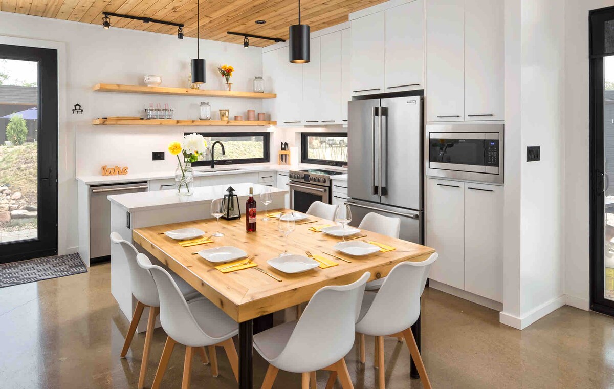 Отдохните и насладитесь умиротворенным жильем и уникальным завтраком для самостоятельного приготовления пищи, заранее спланированным хозяином. Наслаждайтесь собственной площадью 1/3 акра. Начните утро с кофе на террасе и закончите вечер с вином у огня. Холодная ночь? Наслаждайтесь джакузи на открытом воздухе или уютным костром в помещении. Жилье расположено всего в 6 минутах езды от центра Васагаминга, где можно насладиться магазинами, ресторанами, тропами, пляжами и катанием на коньках, а также новым спа-салоном Klar So Nordic. Забронируйте жилье сегодня!