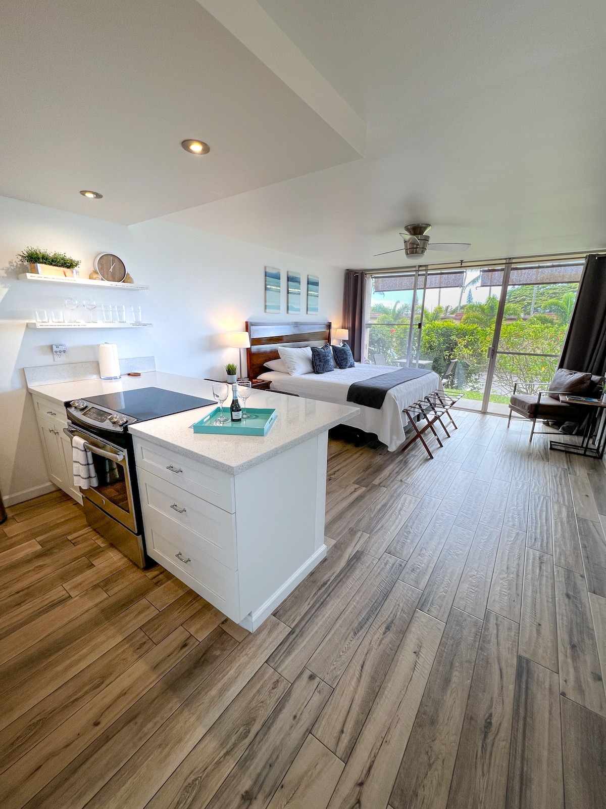 Aloha! Corner unit . 43 vizio TV(Smart) Free WiFi 1 King size bed Ceiling fan AC 12000 BTU Balcony’s chair Beach umbrella Beach chairs (2) And cooler Oven Microwave Refrigerator Pots,pans,utensils Coffee maker Complimentary coffee Set of beach towels (2) Set of towels,hand towels Etc Hair dryer Pool/all year around Iron Start up hand soap shampoo,conditioner. Free parking Bbq area Toaster Blender Sal/pepper Ceiling fan 10 min walk to Napili bay