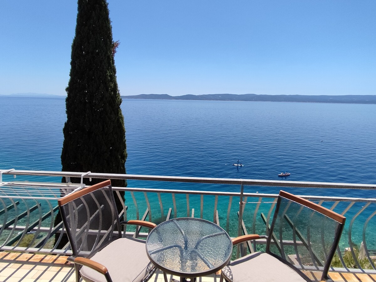 Уютная квартира для 4 гостей, 2 террасы с прекрасным видом на море и острова, прямо над пляжем. Частная парковка, близость продуктового магазина и ресторана, 15 минут езды от города Омис и 10 минут езды от Брелы, одного из самых красивых пляжей в Европе. Большие группы могут проверить доступность остальных наших апартаментов в одном доме - две террасы с прекрасным видом на ПЛЯЖ - ВОСТОК (4 гостя), большая терраса (6 гостей) и арка терраса (4 гостя)
