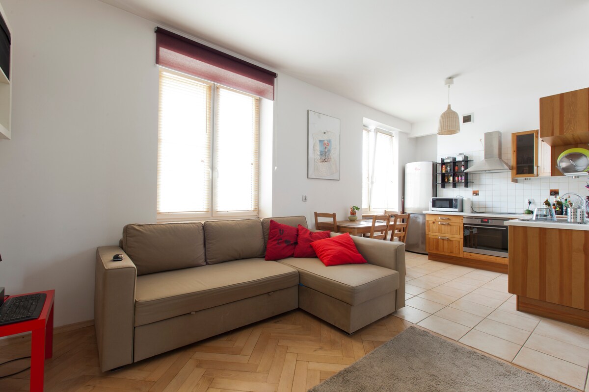 Недавно отремонтированная квартира площадью 41 кв. м в нескольких шагах от главной площади. Квартира просторная и состоит из гостиной с открытой кухней, спальни на антресоли и ванной комнаты. Поскольку диван в гостиной трансформируется, у нас есть место для проживания 4 человек. Кухня новая и полностью оборудованная. Духовка, посудомоечная и стиральная машины — все здесь, так что не стесняйтесь пользоваться ими. За зданием есть бесплатная парковка для жильцов. Правило «живой очереди».