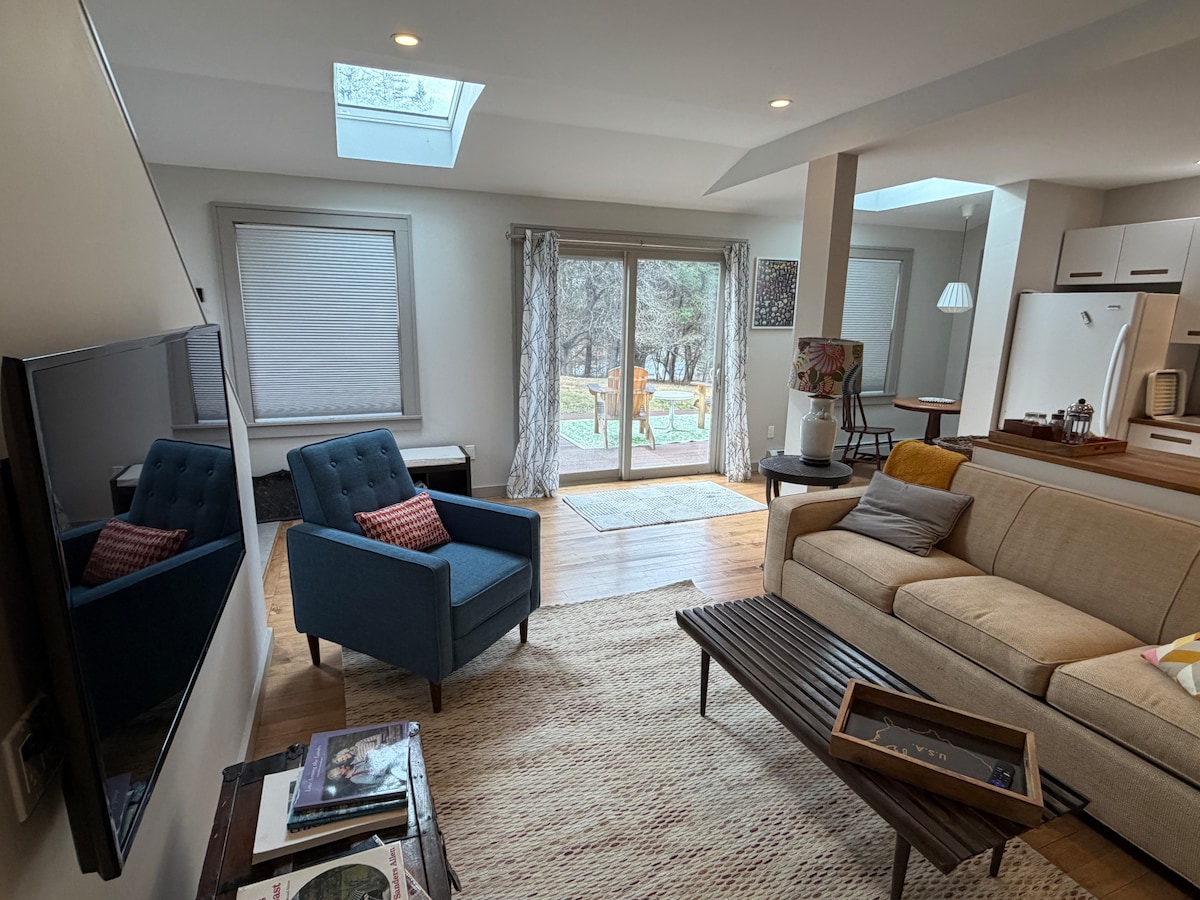 This unique loft apartment, on 70-acres, is a quiet “getaway” designed for relaxation, recreation and restoration. Also excellent for remote work. Apartment is defined by its beautiful post-and-beam architecture and light-filled space. Includes: * private bedroom * large open-plan living room with sleeping nook, dining area, smart TV * dedicated workspace * well-equipped kitchen w/ new appliances * bathroom with bath/shower Above the garage, apartment has a private entrance with keypad.