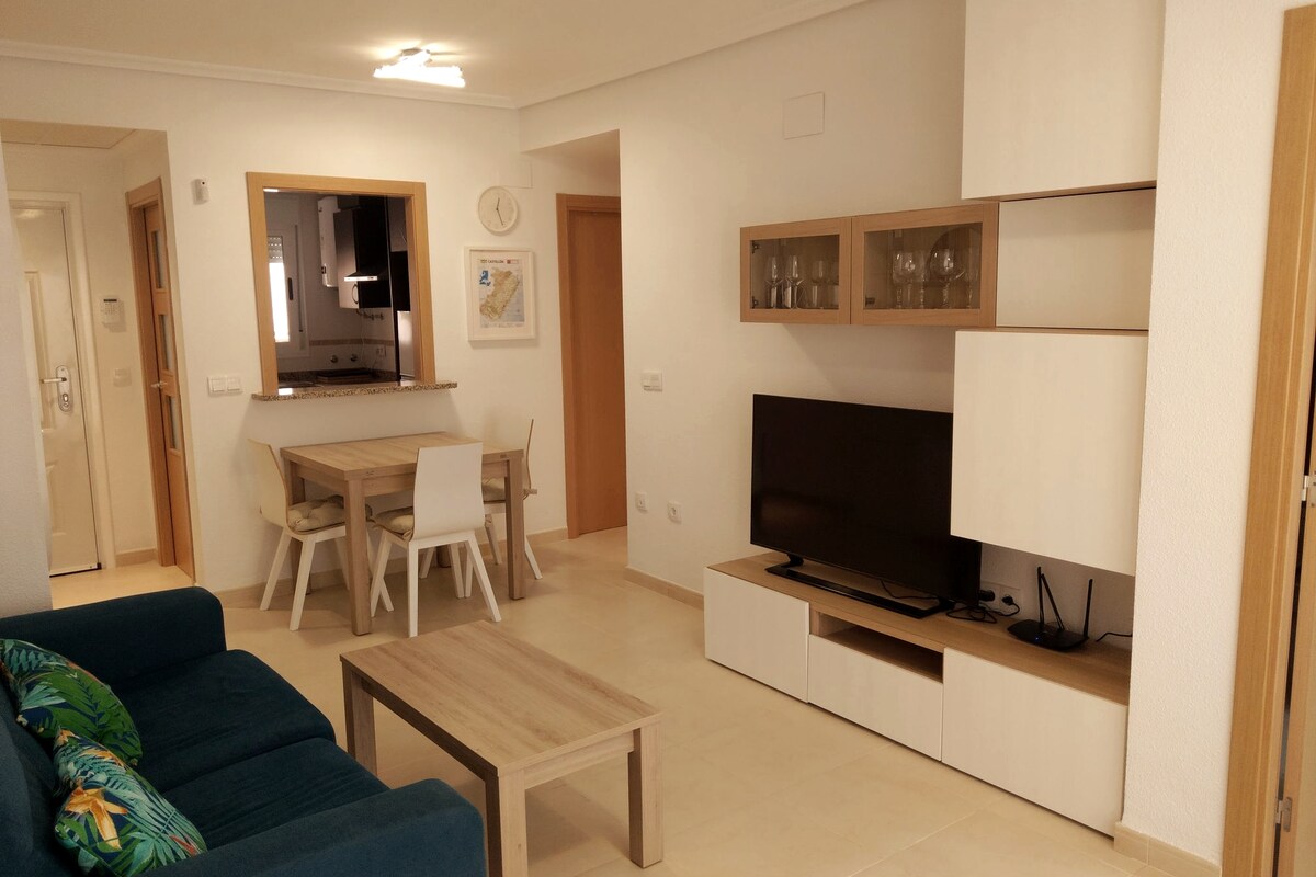 Marina Dor Disponible estupendo apartamento en una de las mejores urbanizaciones Playa Dorada. Disfruta de unas vacaciones tranquilas en 1ª linea de playa pero al lado de todo. Capacidad hasta 6 personas. Equipado con todo para que solo te preocupes de venir y disfrutar Aire acondicionado Terraza con vistas al Mar 2 Baños bañera hidromasaje y plato de ducha plaza de parking subterráneo Piscina Cerca de supermercados 2 dormitorios salon con sofá cama wifi y Smart TV