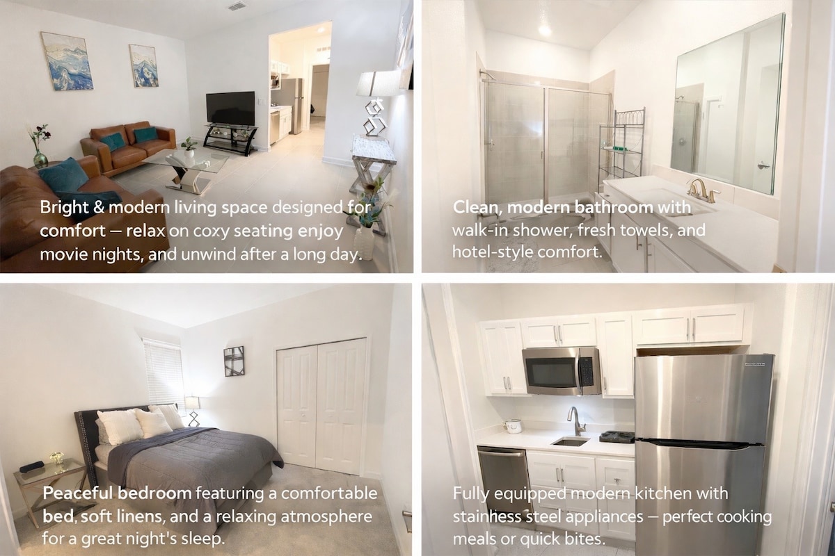 Уютный оформленный и комфортабельный таунхаус с частным джакузи. В нескольких минутах ходьбы от волшебства, в 15 минутах от SeaWorld, в 20 минутах ходьбы от Universal и в нескольких минутах ходьбы от Старого города. Этот таунхаус был недавно зарегистрирован в феврале 2023 года, которым управляет опытный второй хозяин с более чем300 отзывами почти 5 звезд. Наш главный приоритет позаботится о том, чтобы ваше пребывание прошло гладко, независимо от того, ни на один день, одну неделю или месяц. Жилье полностью убирается после каждого гостя. Вы можете забронировать жилье у меня с уверенностью!