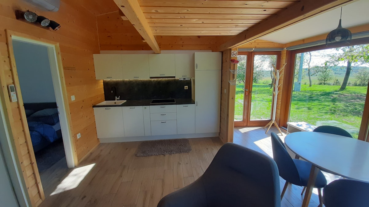 Этот маленький деревянный дом состоит из спальни, оборудованной мини-кухни, гостиной, спального лофта и ванной комнаты. Он расположен на вершине холма, в окружении прекрасной природы, в тихом месте без пробок и прекрасных видов на поля и горы. Утром вы слышите только пение птиц и можете наслаждаться тени деревьев, окружающих дом в течение всего дня.