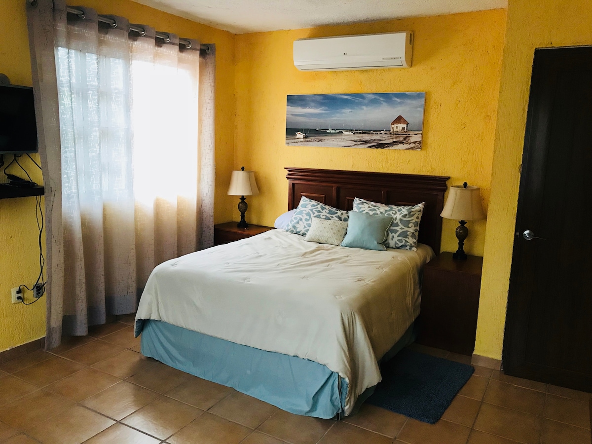 Cuarto independiente con A/C, a 10 minutos del aeropuerto y a 4 minutos de la terminal de autobuses, cerca de centro comercial, cuenta con una cama King Size y una Hamaca, baño completo con agua caliente , televisión smart con aplicacion netflix y youtube, wifi las 24 horas, closet, ventilador y área para trabajar. Tiene parque enfrente donde hacen actividades de zumba y cardio, gimnasio cerca y tienda Oxxo así como farmacias y negocios de comida rapida.