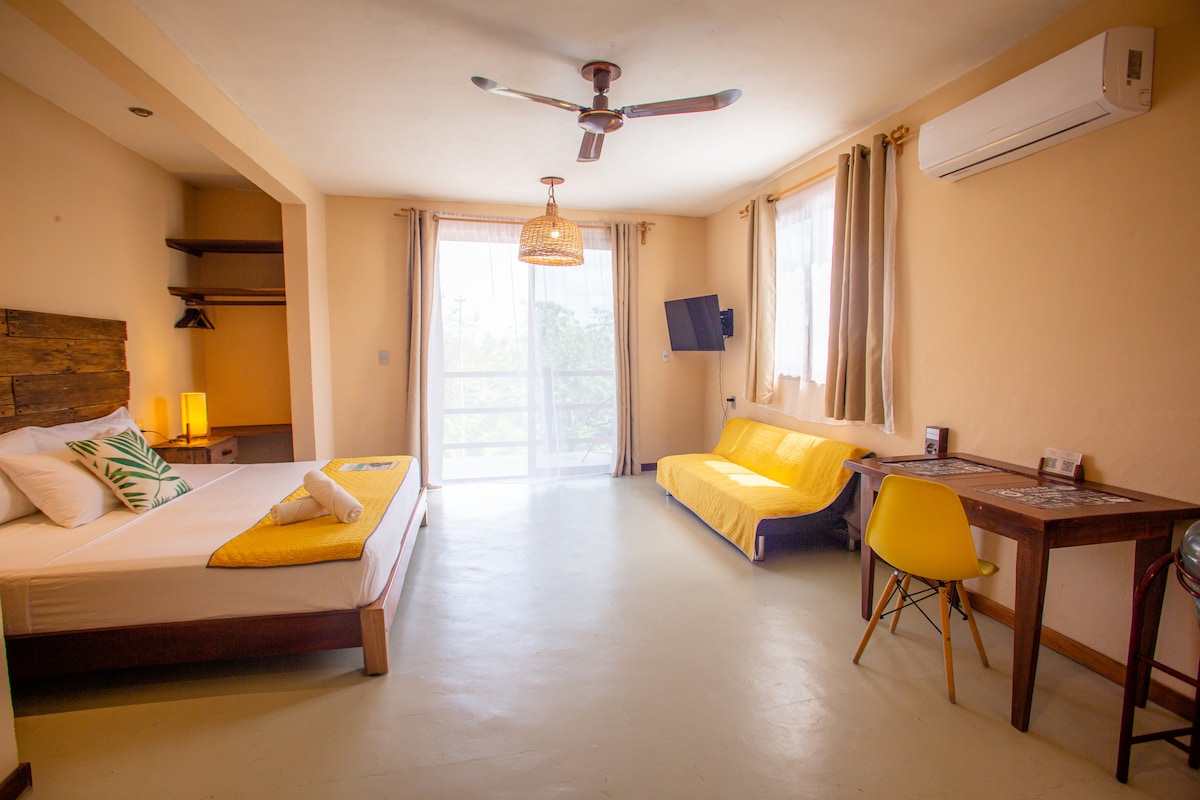 Квартира-студия на первом этаже в Hotel & Suites Oasis Bacalar очень практичная, уютная и милый. — Просторная, открытая планировка. — Кровать квин-сайз. — Полностью оборудованная кухня. — Полноразмерный холодильник, микроволновая печь, блендер, тостер, кастрюли/сковороды и различное кухонное оборудование. - Обеденный стол из твердой древесины. — Закрытая зона отдыха с диваном и журнальным столиком. — Отдельная открытая зона со стульями и столом. — Вторая зона отдыха на открытом воздухе с видом на бассейн. - Быстрый Wi-Fi. — Телевизор с Roku. - Первоклассное расположение!