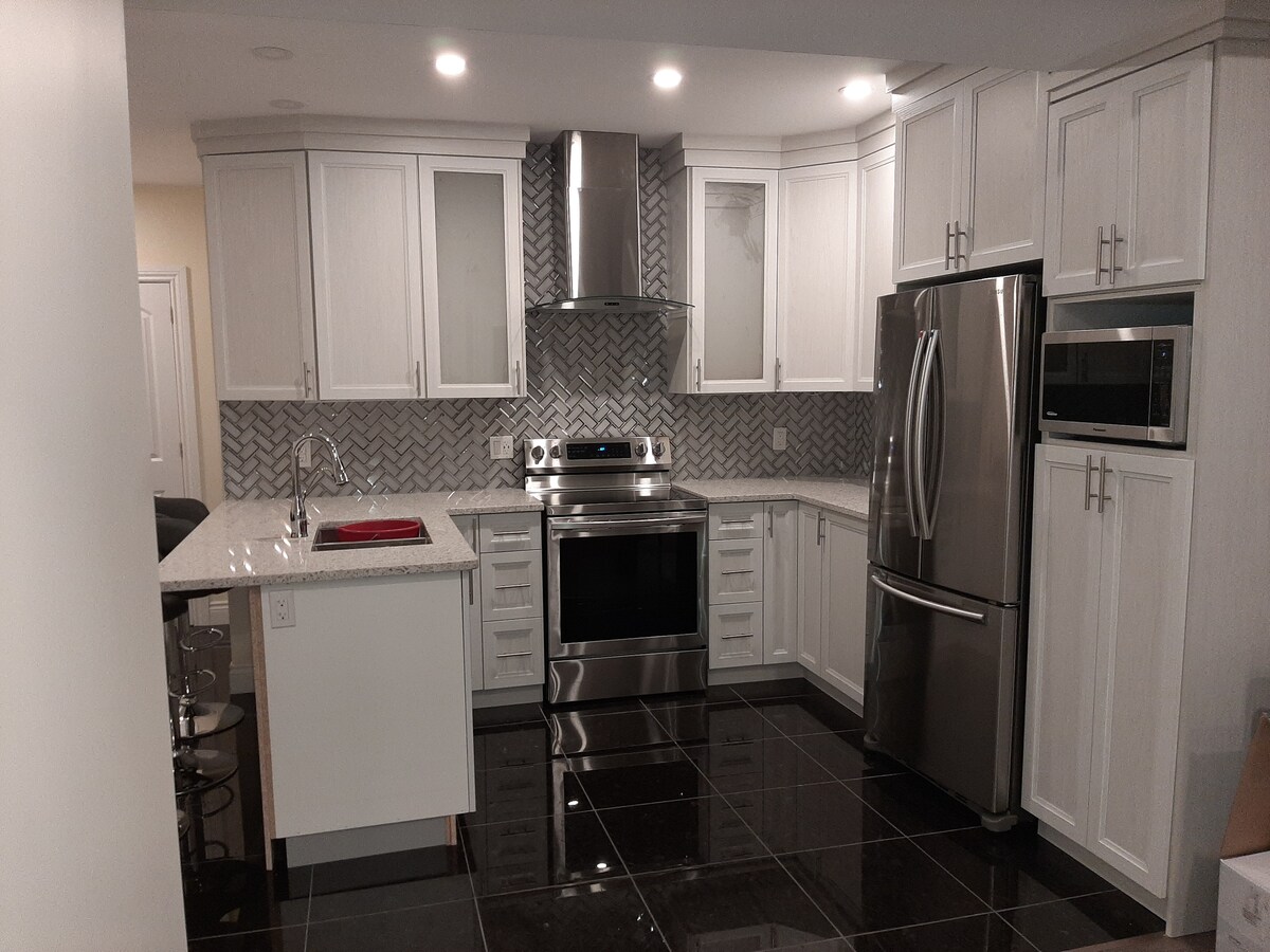 Отдельный роскошный гостевой люкс в доме с отдельным входом. Полностью меблирована. Общая площадь1000 кв. футов с 1 большой спальней с двуспальной кроватью размера King size, большой гостиной с домашним кинотеатром+ 65-дюймовый телевизор , полная ванная комната, прачечная и красивая современная кухня. 2 больших окна и короткие стены на цокольном этаже. Расположено недалеко от шоссе 416 и 417, 23 минуты до центра Оттавы, 13 минут Kanata Park&Ride, 12 минут на поезде Fallowfield и 29 минут до аэропорта. Наслаждайтесь жизнью на природе в центре города. Месяц в месяц