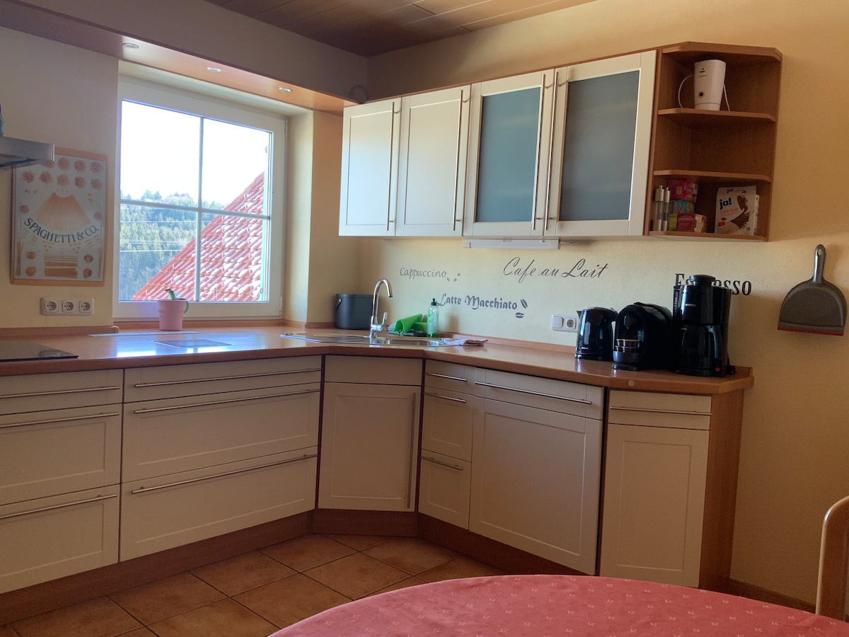 Это тихое место, которое раньше было фермой, идеально подходит для семей/групп. Квартира расположена на первом этаже отдельного дома. Квартира площадью около 100 м² и предлагает 6+2 спальных места. Дом бесплатный, окружен полями и лугами. Расстояние до ближайшего города около 2 км. Здесь вы найдете пекарню, мясную лавку, а также ресторан с буржуазной немецкой кухней. Расстояние до шоссе (A7) составляет около 3 км.