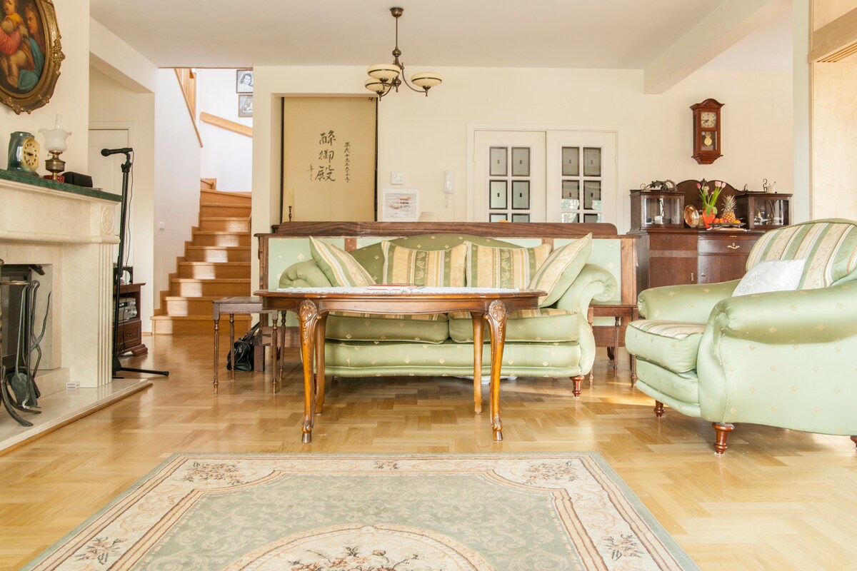 Дом в пригороде Варшавы в большом саду. На территории есть частный открытый бассейн. Тихий и зеленый. Очень хороший доступ к центру Варшавы. 30 минут на машине или поезде. Интернет со скоростью 600 Мбит/с. Парковка на территории. Бассейн, площадка у бассейна, патио. Полотенца и постельное белье. Большой плазменный телевизор, спутниковое телевидение. 4 комнаты, две ванные комнаты, одна с ванной, другая с душем, хорошо оборудованная кухня. Первый и второй этажи. Моя семья живет в другой половине дома.