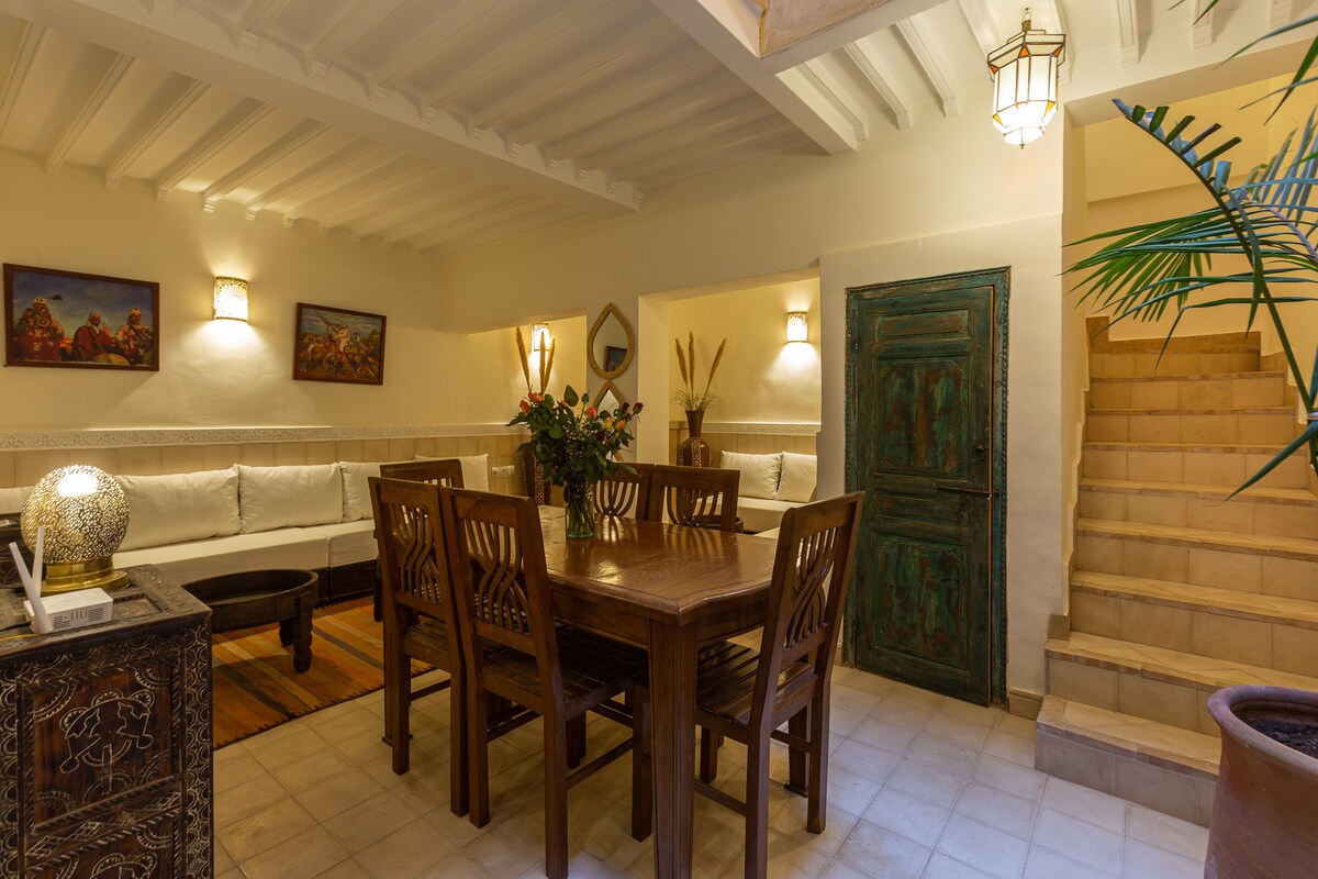 ☀️ Заходите, оставляйте сумки — обо всем остальном мы позаботимся. Ваш частный риад в центре Муассина: бассейн, терраса на крыше, и каждое утро Амина готовит домашний марокканский завтрак только для вас. Ежедневная уборка и свежее постельное белье включены в стоимость. Нет общих помещений: весь риад принадлежит только вам. Отдыхайте, исследуйте окрестности, наслаждайтесь — всего в 5 минутах ходьбы от площади Джамаа-эль-Фна. Добро пожаловать домой. 🌴