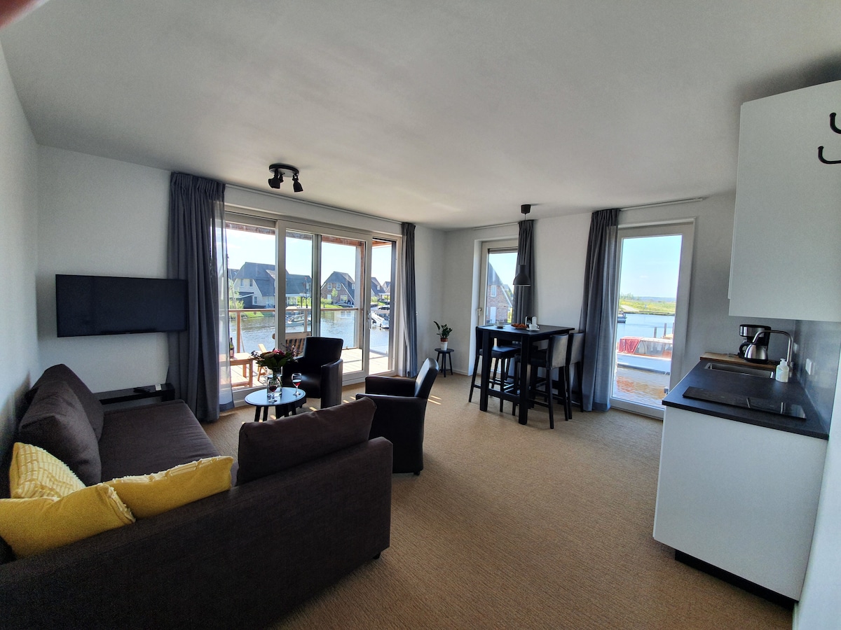 Dit heerlijk appartement, gelegen op de eerste etage, heeft een prachtig uitzicht over de landerijen, ligt direct aan het water en biedt volop privacy. Via de voordeur komt u in een ruime hal waar u de trap oploopt en binnenkomt in het appartement. Via de gang bereikt u de slaapkamer met een comfortabel tweepersoons boxspringbed. Tegenover de slaapkamer is het toilet met daarnaast de ruime badkamer. Aan het eind van de gang is de ruime sfeervolle woonkamer met keuken en ook twee slaapplekken.