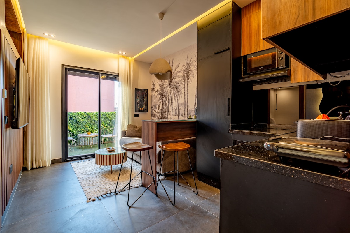 Bienvenue dans votre oasis privée au cœur de Marrakech un studio à l’inspiration tropicale, conçu autour d’un concept pur et apaisant. Ici, chaque détail invite à la détente, entre nature, lumière et confort moderne •le petit bassin privé en plein air pour un moment de bien-être • Douche extérieure rafraîchissante, ambiance naturelle • Terrasse tropicale idéale pour se détendre ou partager un repas • Décoration soignée aux tons naturels et matériaux.