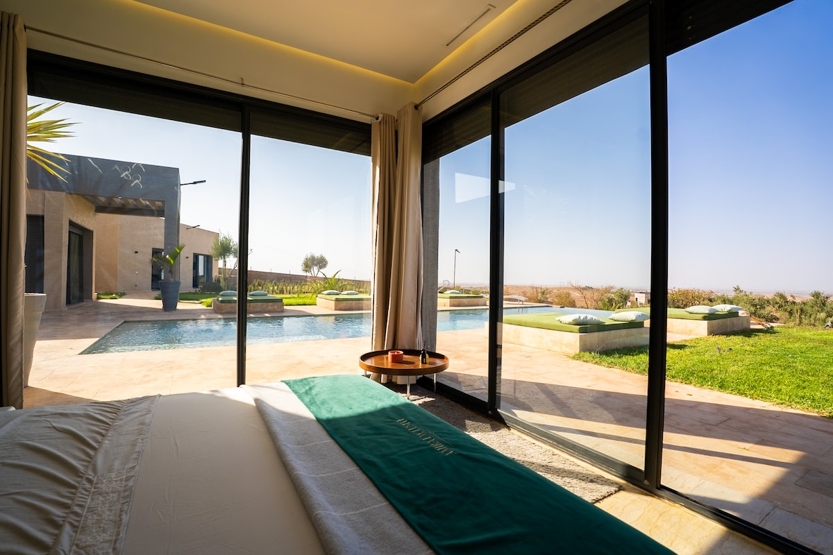 A rare designer villa set on private land, offering total tranquility, breathtaking Atlas Mountain views, and a stunning infinity pool created for unforgettable stays just outside Marrakech. Enjoy refined indoor-outdoor living, curated interiors, and peaceful sunsets, with a complimentary Moroccan breakfast on your first morning.