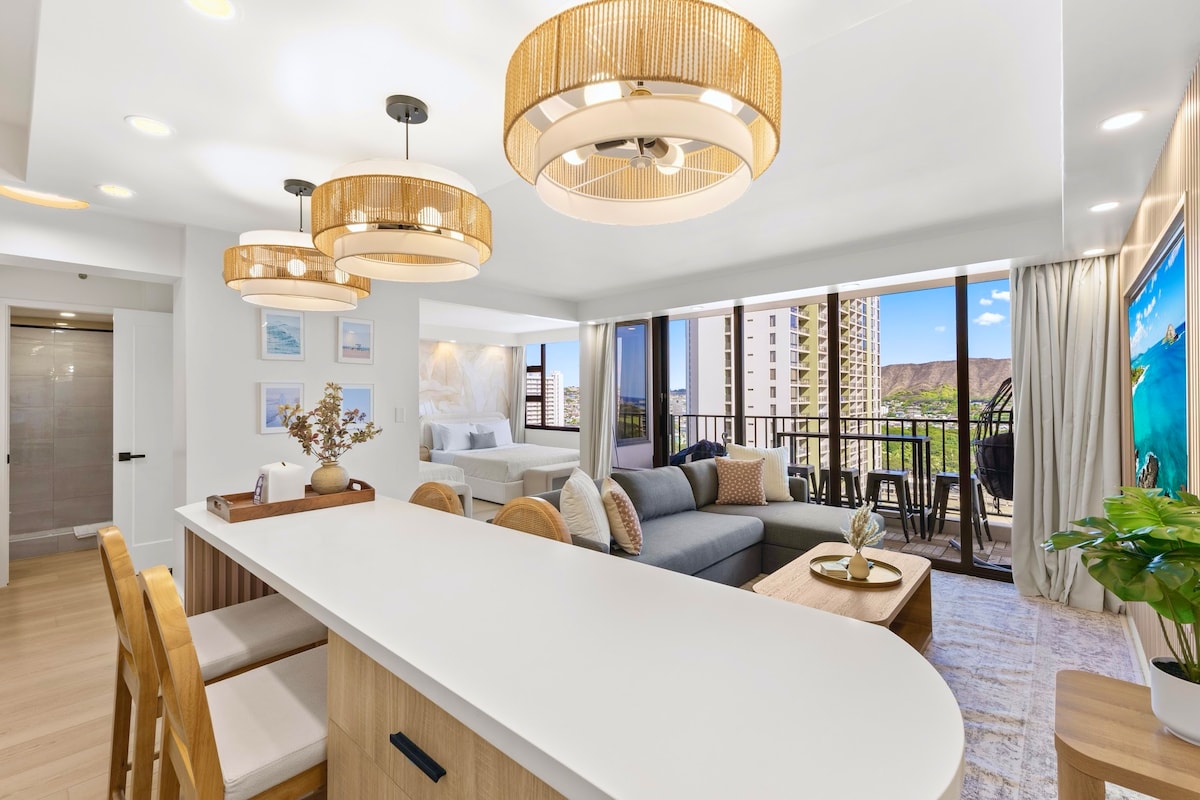 Aloha and welcome to one of the most amazing complete remodels you will find in Waikiki - completed end of 2022. This one-of-a-kind 1 bedroom with free 1 parking stall, pool and gym boasts spectacular ocean & Diamond Head views and is only 0.2 miles (5 min walk) from Waikiki Beach and closer to endless restaurants, shopping & so much more. We would love to have you stay with us and create memories in this truly magical place that is centrally-located, well appointed, and with fabulous views!