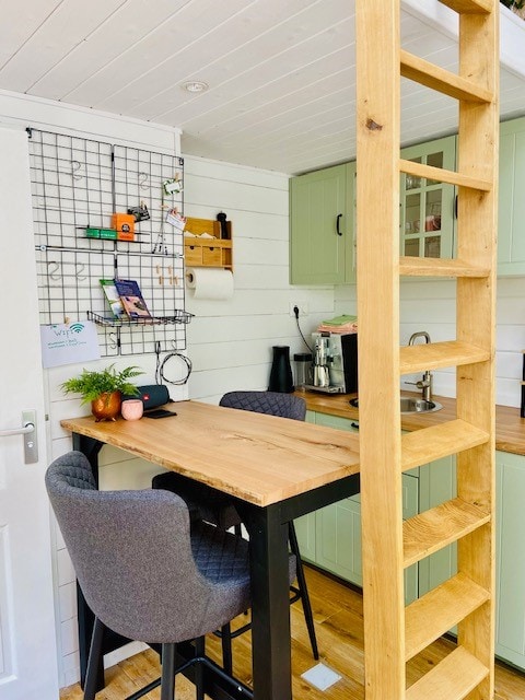 Отдохните в укромном и уединенном месте. Наш стальной дом, возвышенный на сваях, предлагает уединение и редкую связь с природой. Расслабьтесь в сауне для спокойного отдыха. В самой высокой точке над водой вам уютно расположена гостиная зона с дровяной печью на 360 градусов. Наслаждайтесь вечерами в кино с бимером и динамиком для дополнительных развлечений. Снаружи вас ждет просторная деревянная терраса с шезлонгом, обеденным столом на открытом воздухе, барбекю, печью для пиццы и потрясающим видом на озеро. Для владельцев собак: жилье огорожено😊