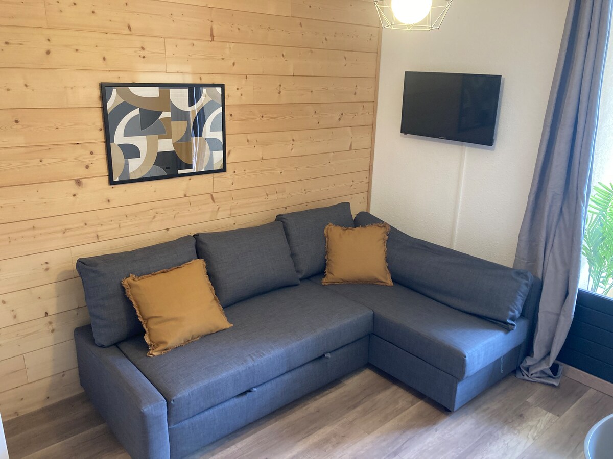 Enjoy easy access to a host of amenities in this family, friendly resort from this recently renovated, cosy (23m2) studio. Sleeps 4: 2 in the convertible beds set up as a double or 2 singles in the main area and 2 in the "coin de montagne" in bunkbeds. It has a west facing balcony with magnificent views of the Belledonne and a ski locker. We own another 2 studios on the same corridor which my wife (superhost) has rented since 2020.