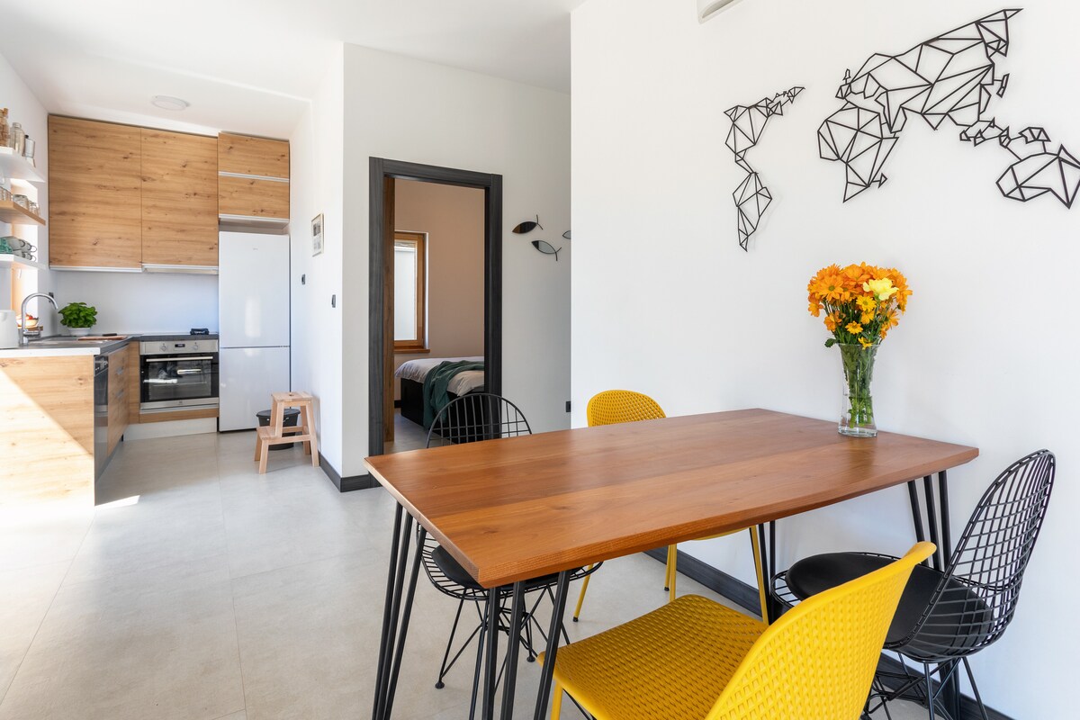 Квартира площадью 60 м 2 состоит из спальни с большой двуспальной кровать, ванной комнаты, просторной гостиной с кухней, прихожей и балкона. Вся южная стена в море находится в стекле, поэтому в помещении много света, и с балконом составляет одно пространство. Квартира расположена на третьем этаже дома, который находится недалеко от центра города (5 минут приятной прогулки вдоль моря), а с балкона открывается открытый вид на море и острова, так как дом расположен в первом ряду у моря.