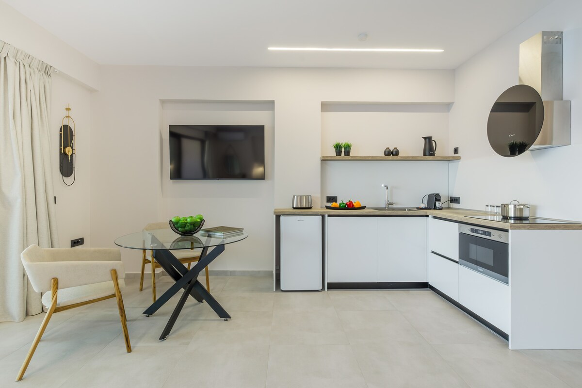 Fteri — это современная минималистичная резиденция площадью 45 кв. м с двуспальной кроватью размера King size, роскошной дизайнерской мебелью и освещением, уникальной ванной комнатой с видом на море и различными удобствами. С впечатляющей веранды длиной 5,5 м с элегантными подвесными качелями гости могут погрузиться в бесконечные бирюзовые воды острова, а частный спа-салон на открытом воздухе с озонотерапией (работает при температуре около 30 градусов) с видом на пляж Аг-Кириаки дарит уникальное ощущение роскоши и релаксации.
