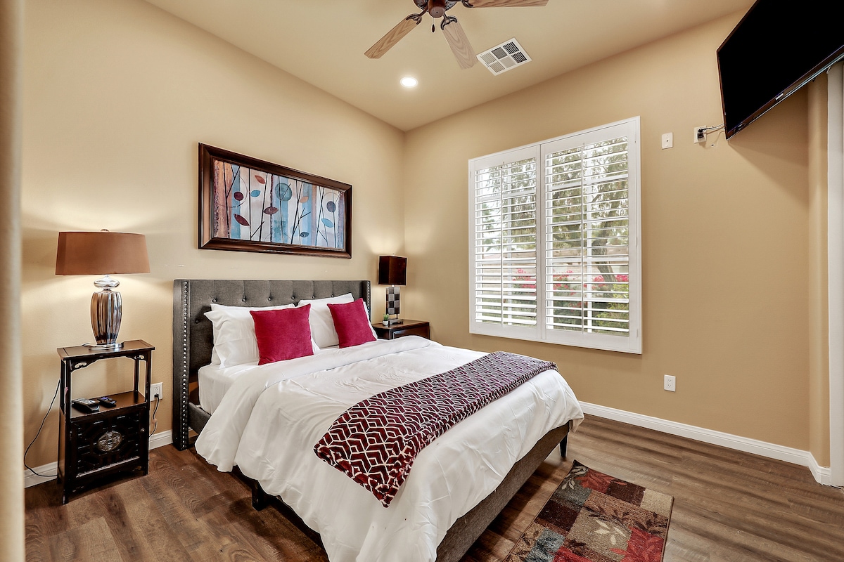 Красивая высококлассная казита с отдельным входом, расположенная в тихом районе в нескольких минутах ходьбы от Trader Joes, ресторана El Paseo и торгового района, популярных пешеходных маршрутов, зоопарка Living Desert и парка Civic Center. Keurig с бесплатными капсулами, Wi-Fi, смарт-телевизором, кабельными каналами, киноканалами и частным центральным кондиционером. Подходит для питомцев, смотрите подробности ниже! Не стесняйтесь заказывать или отправлять SMS с вопросами.