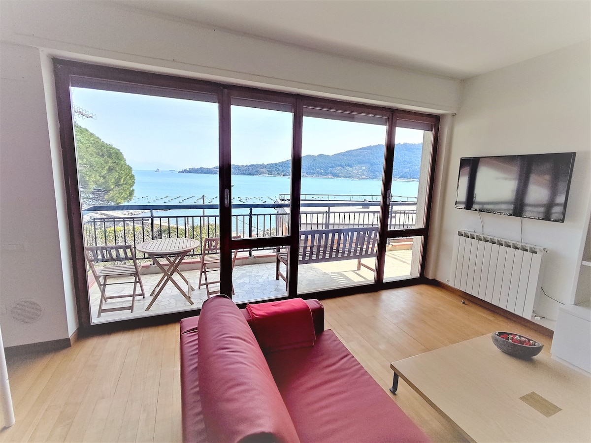 Из окон открывается вид на побережье Портовенера с пляжем "Аренелла", автобусная остановка напротив дома, в 5 минутах ходьбы от исторического центра и отъезд лодок на остров 5 Terre и остров Пальмария. Замощенная тиком, оборудованная большая гостиная с оборудованной мини-кухней, терраса с видом на море, телевизор, 4 кровати, чайник, микроволновая печь, 2 ванные комнаты с душем, фен, использование стиральной машины. Вы приезжаете под домом на машине, чтобы разгрузить свой багаж и зарегистрироваться. WI-FI - кондиционер -