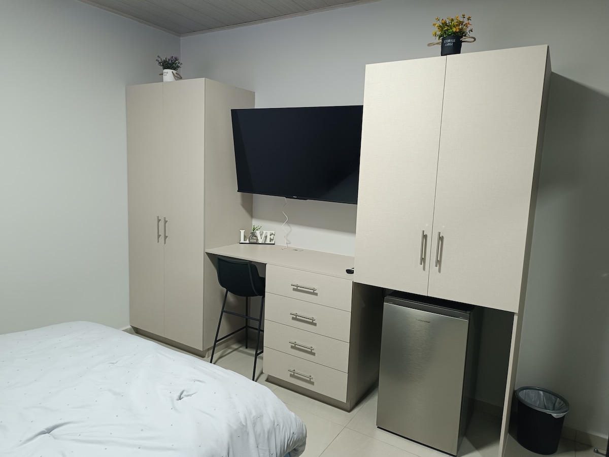 Suite con entrada independiente: estacionamiento techado, cama doble, baño sanitario, cocineta y escritorio. Tu espacio personal en el corazón de David. Cuenta con aire acondicionado tipo split, abanico de techo, TV con acceso a netflix, internet wifi gratis, cortinas black out, tanque de reserva de agua, agua caliente, cocineta equipada con estufa eléctrica, refrigerador, cafetera, microondas y utensilios básicos. No cuenta con lavandería, generador eléctrico y aislamiento acústico.