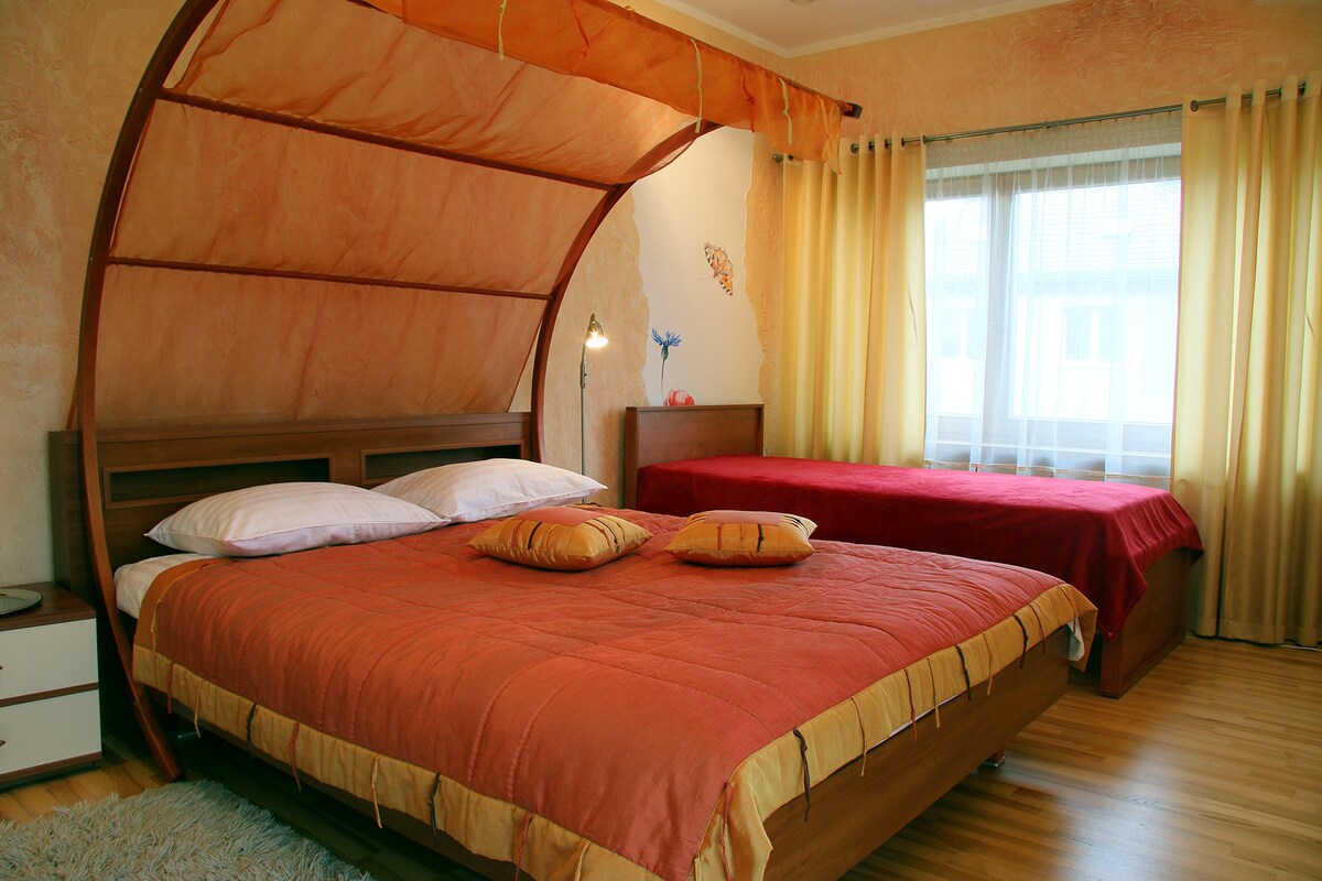 We offer you to stay at spacious (65 sq/m) , freshly renovated apartment near city center of Panevezys. You will have entirely floor of the house with separate entrance. The apartment features 2 bedrooms, 1 bathroom, living room with 2 sofa beds, a dinning area with a flat-screen TV with cable channels and fully equipped kitchen. And, in our opinion, the best part - cozy terrace with garden and city view!