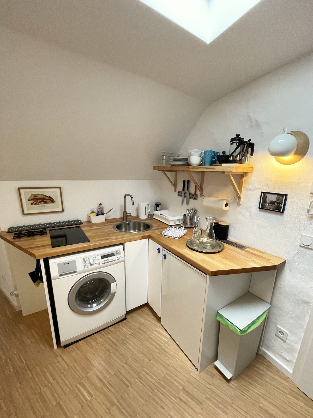 Наша светлая квартира на крыше с 150-летними деревянными балками находится в центре прекрасного района. К услугам гостей небольшая, но стильная кухня и роскошная ванная комната, оборудованная тропическим душем и финской сауной. Мы предлагаем Netflix, кабельное телевидение и очень быстрый Интернет. Ваше пребывание у нас будет полностью углеродно-нейтральным. В квартире могут разместиться до трех взрослых или двое взрослых с детьми.