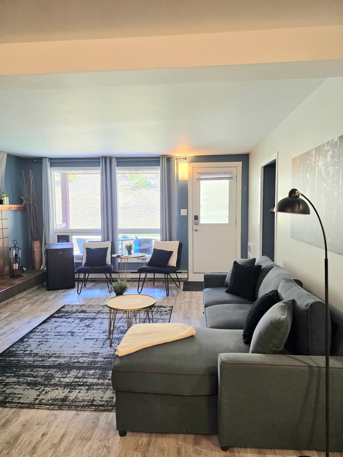 Fall in love with the Rocky Mountains in this creek side ski in ski out townhouse. Fully renovated, this beautiful Riverbend Panorama home, with a view of the mountains, is located steps away from the gondola and hiking trails along the picturesque Toby Creek. There are two separate bedrooms, each with their own full on-suite bathrooms, and a fire side queen size sofa bed (with upgraded foam mattress) in the living room to accomodate a total of six guests.